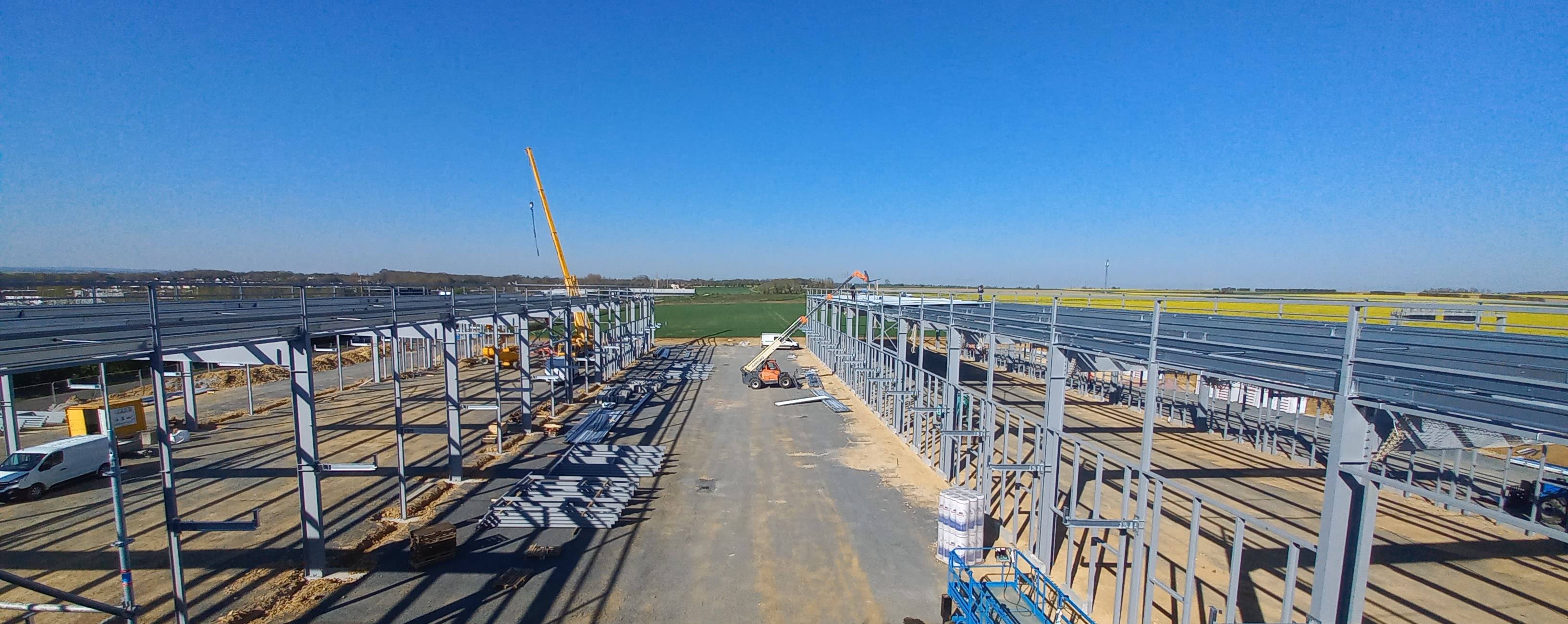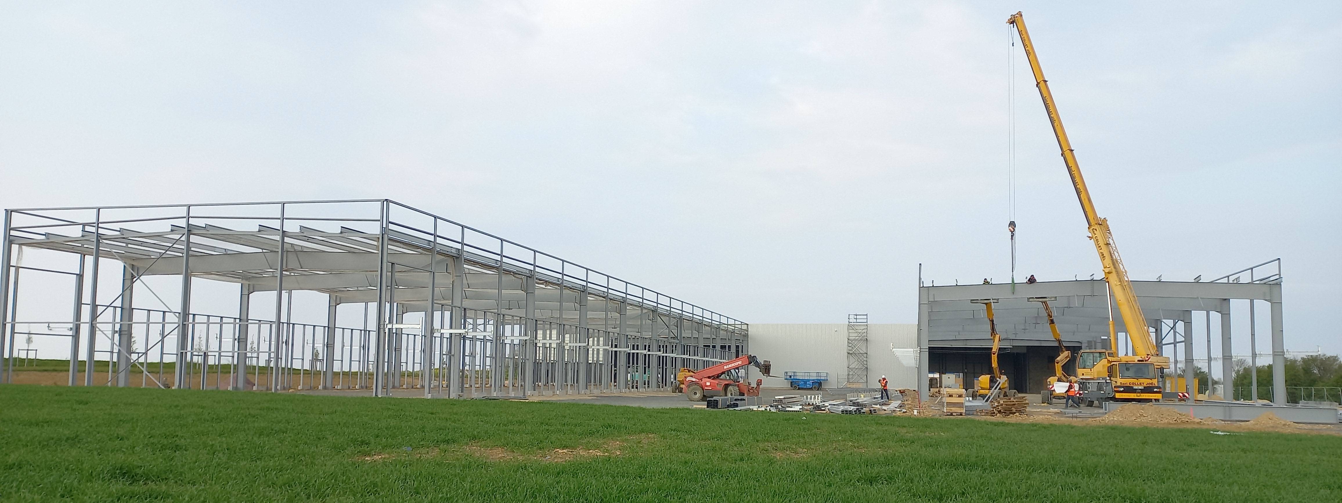 Les équipes de l'Entreprise Métallique Loncle (EML), filiale du Groupe MARC spécialisée dans la construction métallique, sont en cours de pose d'une charpente métallique dans le cadre de la construction d'un nouveau bâtiment de distribution Chronopost de 7600 m².